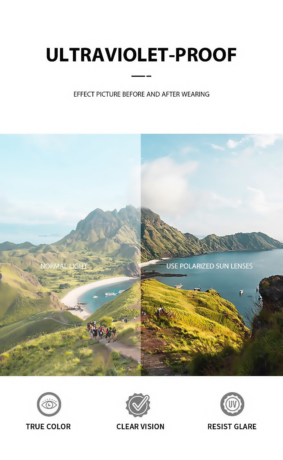 Experience the perfect combination of comfort, protection, and style with our TR7523 Polarized Sunglasses for Men. Designed with lightweight TR90 frames and anti-slip curved temples, they deliver a secure fit without discomfort—ideal for all-day wear. The TAC polarized lenses block intense glare and harmful UV rays, making them a reliable companion for driving, fishing, cycling, hiking, or everyday outdoor adventures.