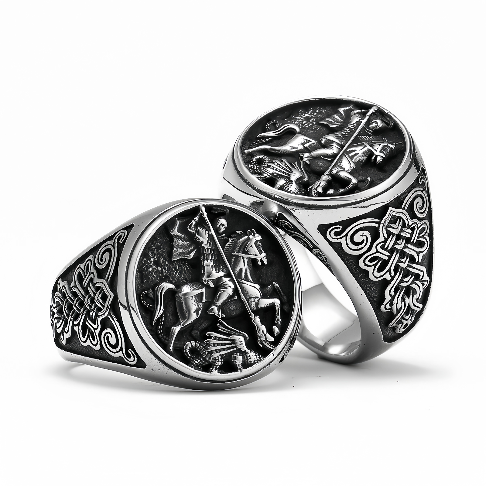 Saint George, the legendary dragon slayer, is another key figure represented in this design. Saint George is a patron saint venerated in various cultures and religions, particularly known for his bravery and chivalry. The tale of Saint George and the Dragon has been told for centuries, symbolizing the triumph of good over evil. This heroic narrative resonates with many, making Saint George an iconic figure in both religious and secular contexts. His inclusion on the ring serves as a reminder of courage, honor, and the strength to face challenges.