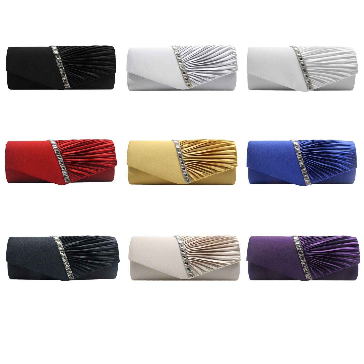 Bring your glamorous evening look together with this stunning NEW Shining Satin Ladies Evening Clutch Bag. The pleated front flap and feature diamante detailing adds a touch of sophistication to the statement-making design, sure to make an impression wherever it's worn. An exquisite choice for stylish occasions.