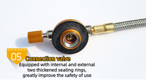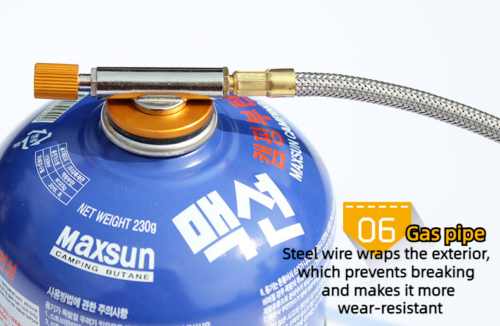 Material is aluminum alloy with stainless steel material, strong load-bearing capacity. Small size, foldable steel support frame, high temperature resistant. High energy ceramic piezoelectric firing system to ensure successful ignition at one time. Gyratory flame, high thermal efficiency, good versatility.