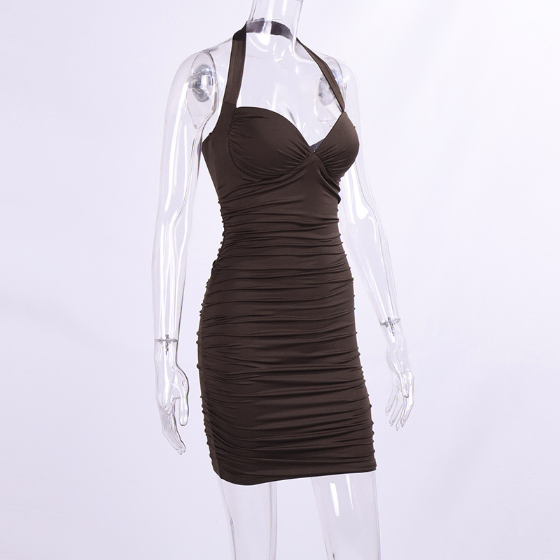 Women Sexy Halter Neckline Backless Tight Fitting Pleated Miniskirt Dress